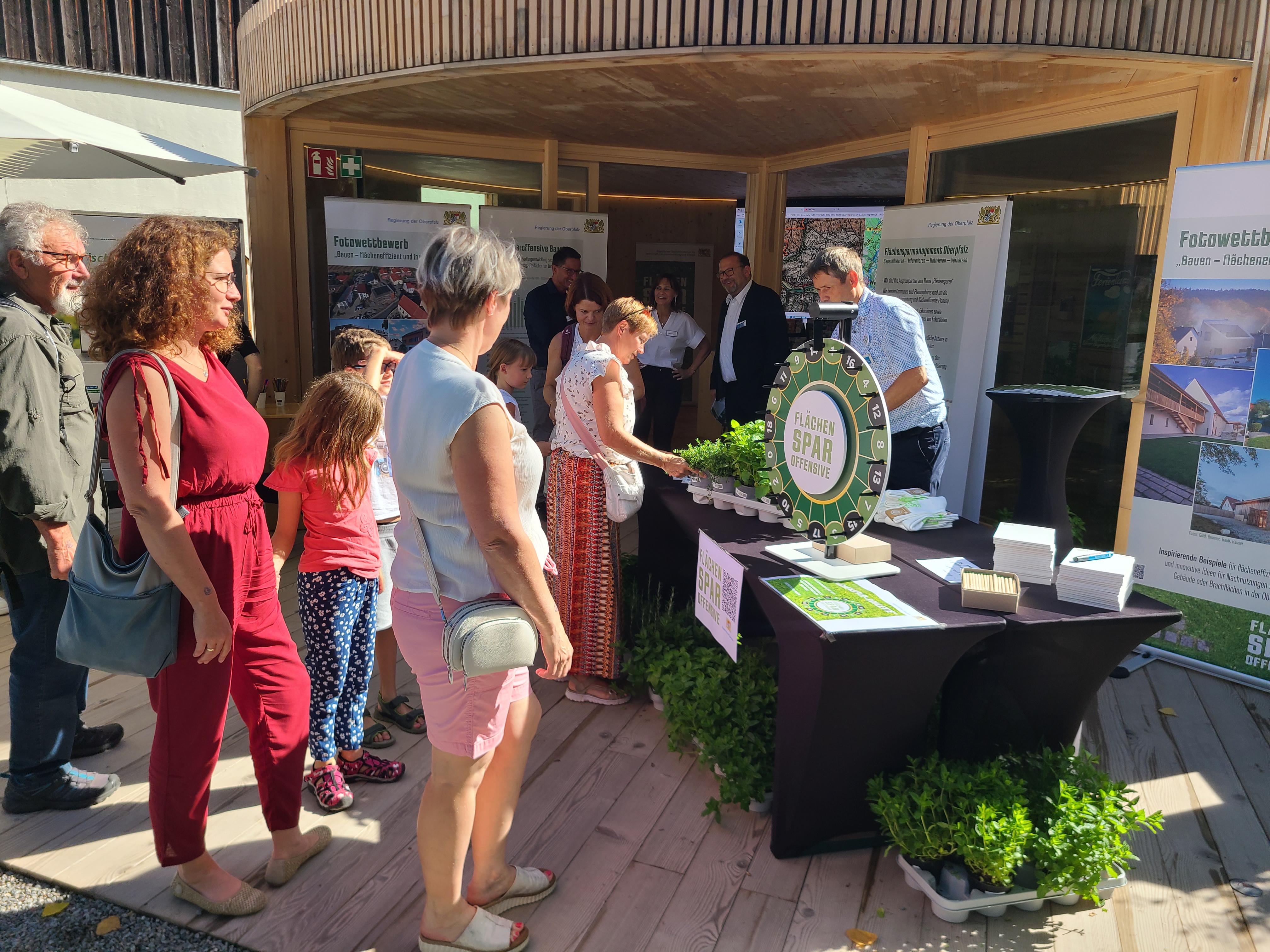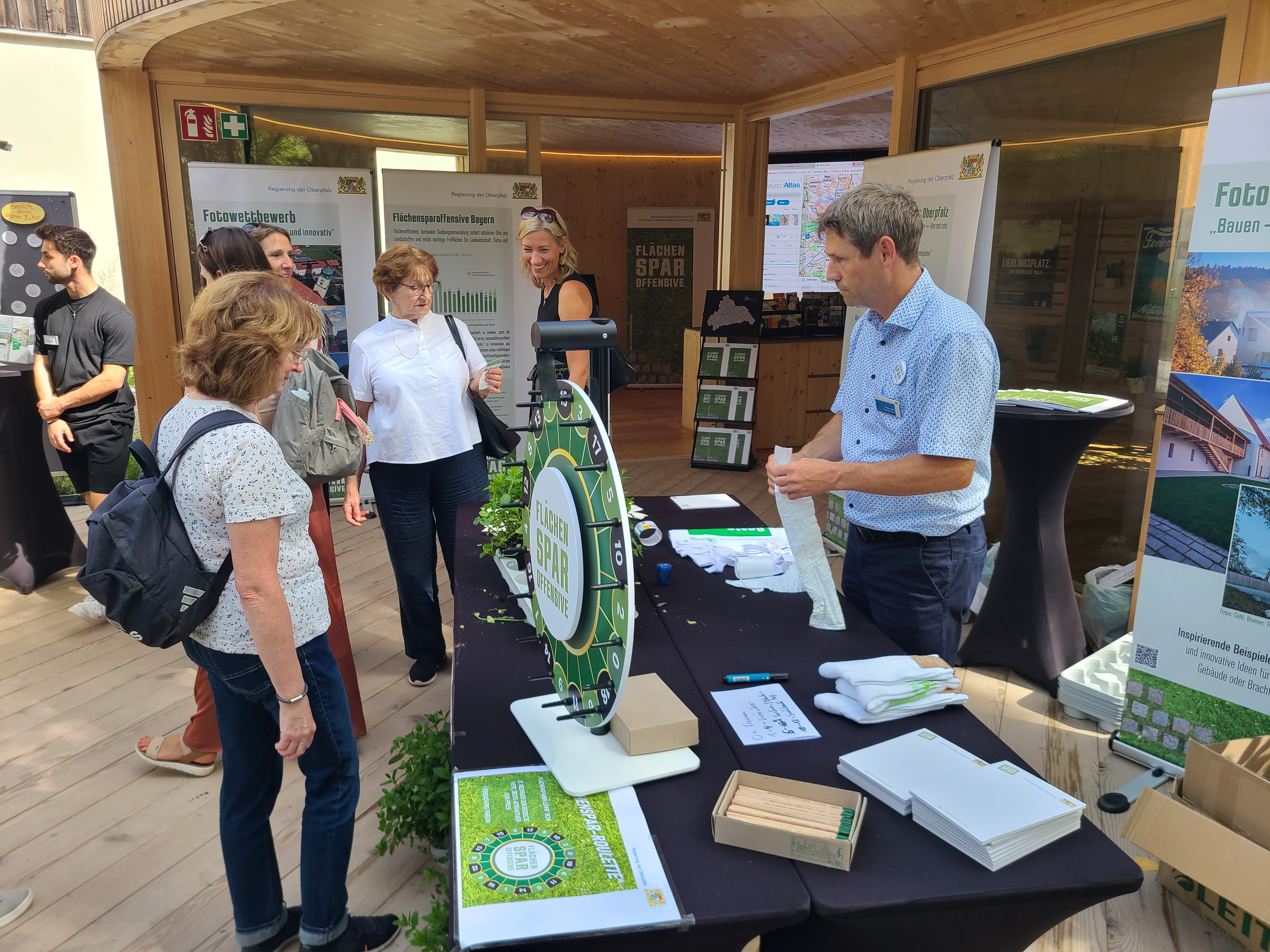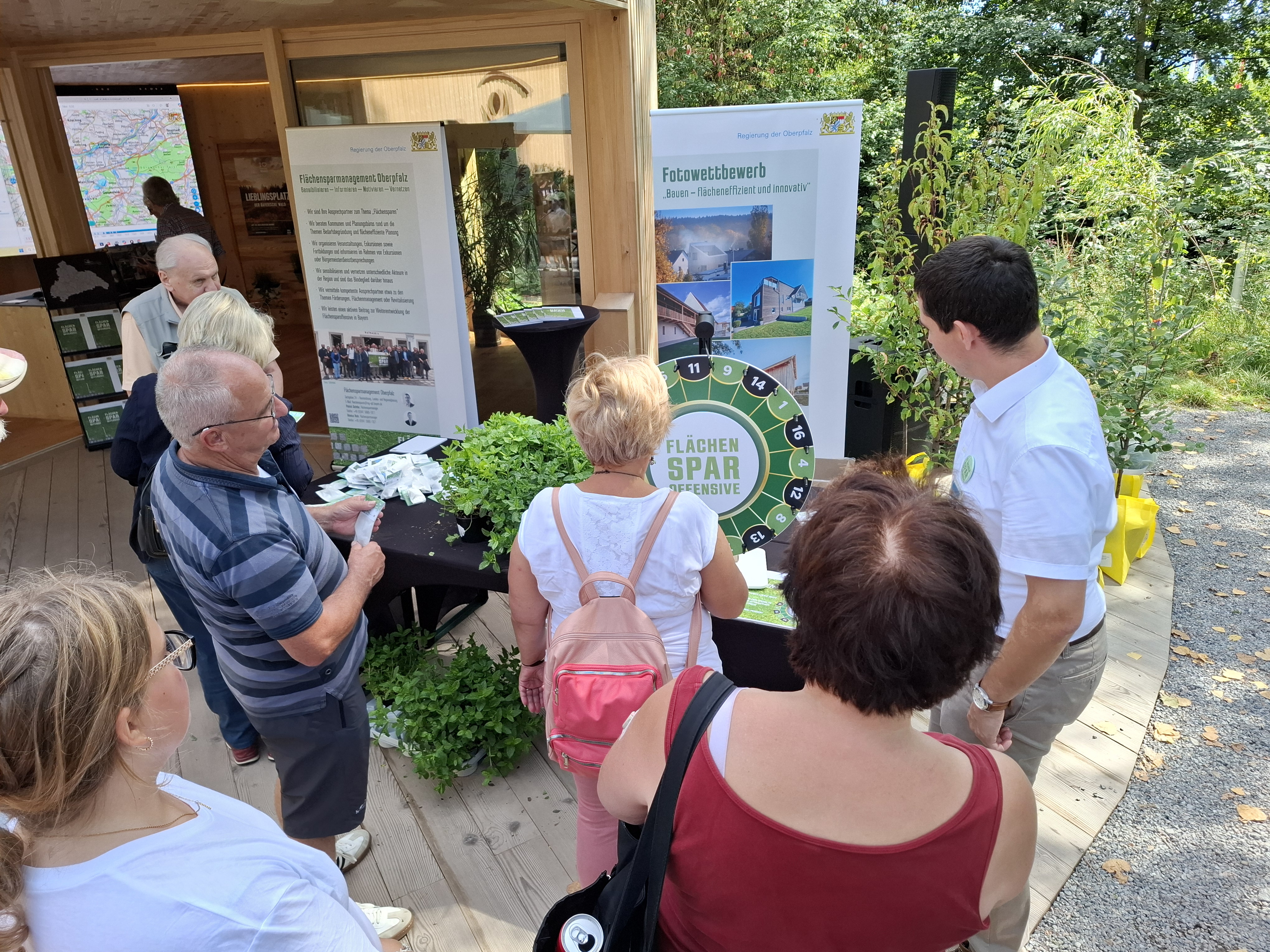 Unter dem Motto „Flächensparen gewinnt“ versuchten beim „Flächenspar-Roulette“ über 800 Besucherinnen und Besucher ihr Glück. In Anspielung auf das Ziel der Flächensparoffensive der Bayerischen Staatsregierung, den künftigen „Flächenverbrauch“ möglichst gering zu halten, gab es Gewinnerpreise für niedrige Werte. Als Hauptgewinn für den langfristig beim „Flächenverbrauch“ angestrebten Wert „0“ konnten sich die Besucherinnen und Besucher über verschiedene Obstbäume freuen, für niedrige Werte unter anderem über Kräuterpflanzen oder Flächensparstrümpfe sowie für „zu hohe“ Werte über Samentütchen für Blühwiesen als Trostpreis.