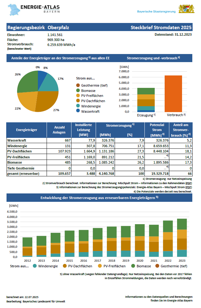 Landkreis/kreisfreie Stadt Anzahl Installierte Leistung (MW) Amberg-Sulzbach 25 65,6 Cham 1 0,8 Neumarkt 65 157,7 Neustadt a.d. Waldnaab 3 5,0 Regensburg 11 29,4 Schwandorf 11 30,0 Tirschenreuth 12 18,9 Regensburg (Stadt) 1 0,5 Summe 129 307,7 (Quelle: Kreisverwaltungsbehörden, Stand 31.12.2024)